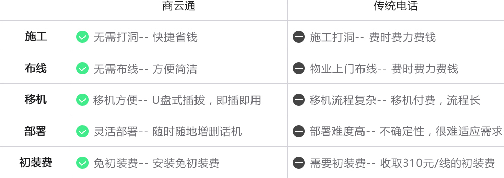 商云通整体采用IP话机的部署方式,公司只需提前一天向电信公司申请,第二天收到IP话机插上工位网线即可使用,人员入驻和流动方便,IT人员运维简洁。采用商云通后,客户群内通话全部免费,不需要购买交换机且可将原有总机携带至商云通平台